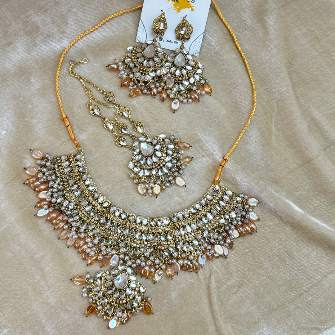 Maroon and Champagne Bridal Set is the perfect harmony of tradition and luxury. Featuring deep maroon stones paired with soft champagne hues, this set radiates sophistication and warmth. Ideal for brides seeking a regal yet graceful look, it adds depth, charm, and a touch of golden glow to every bridal ensemble.